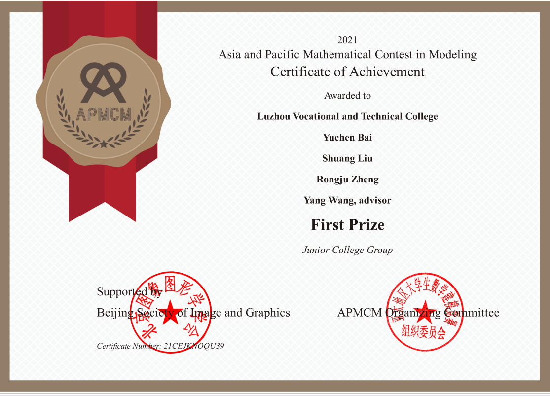 喜报!我校学生斩获2021年第十一届亚太地区大学生数学建模竞赛(APMCM)一等奖