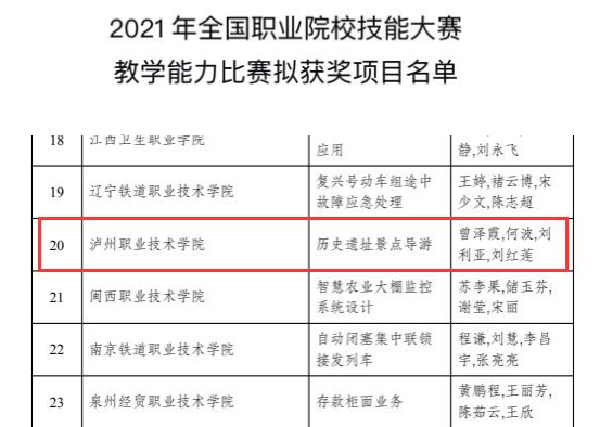 2021年全国职业院校技能大赛教学能力比赛落下帷幕,曾泽霞、何波、刘利亚、刘红莲教学团队第一次作为四川省高职院校的代表角逐国赛,以参赛作品《历史遗址景点导游》勇创佳绩,荣获全国职业院校教学能力比赛二等奖,实现了学校创建国家“双高计划”标志性成果新突破。