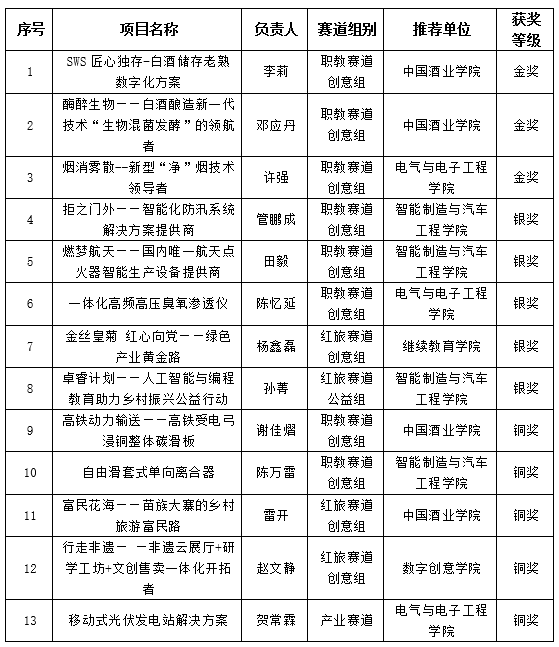“酶醉生物——白酒酿造新一代技术‘生物混菌发酵’的领航者”“SWS匠心独存—白酒储存老熟数字化方案”以及“烟消雾散物——新型‘净’烟技术领导者”3个项目荣获职教赛道金奖,获奖数量位列全省高职高专院校第四,单届大赛获省级以上奖项数量创我校参与此项赛事以来的历史新高!